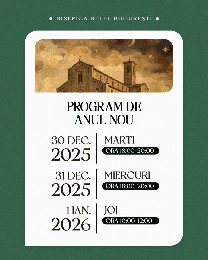 Program de final de an și început de an nou – Biserica Betel București La trecerea dintre ani, ne dorim să fim împreună în rugăciune, mulțumire și închinare, așezând începutul noului an sub călăuzirea lui Dumnezeu. Te invităm să iei parte […]