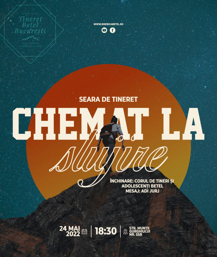 Vă invităm marți, 24.05.2022, ora 18:30, la seara de tineret intitulată ,,Chemat la slujire”. Ne vom închina și lăuda Numele Domnului alături de Corul de tineri și adolescenți Betel. De asemenea, vom asculta un mesaj din parteainvitatului serii, Adi Jurj.