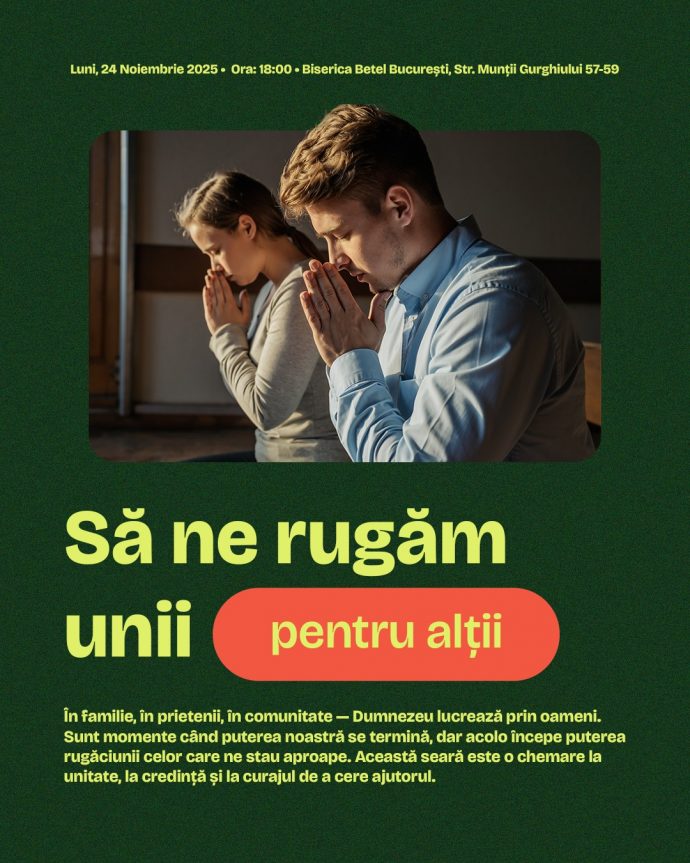 Te invităm să ne unim glasurile și inimile într-o seară specială de rugăciune, în care mijlocim unii pentru alții, crezând că Dumnezeu aduce schimbare.